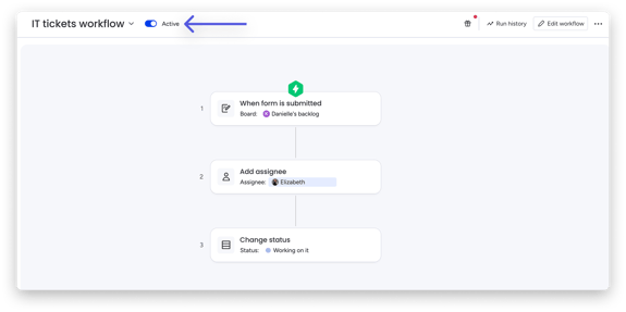 Los disparadores típicos incluyen: creación de un elemento, cambio de estado, movimiento entre grupos o incorporación de un nuevo usuario a la cuenta.